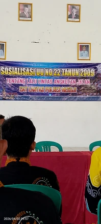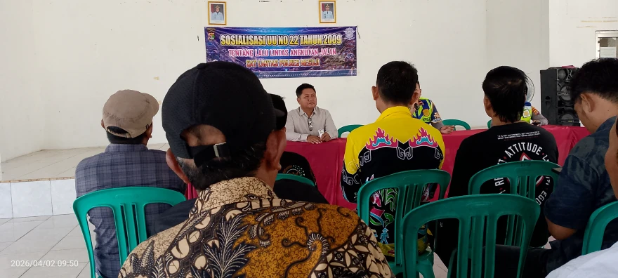Pada hari Kamis, 2 April 2026, Satlantas Polres Mesuji IPDA JOHAN ARISANDI SH.MH melaksanakan kegiatan sosialisasi Undang-Undang Nomor 22 Tahun 2009 tentang Lalu Lintas dan Angkutan Jalan. Kegiatan ini berlangsung di Balai Desa Simpang Pematang dengan dihadiri oleh para aparatur desa setempat.