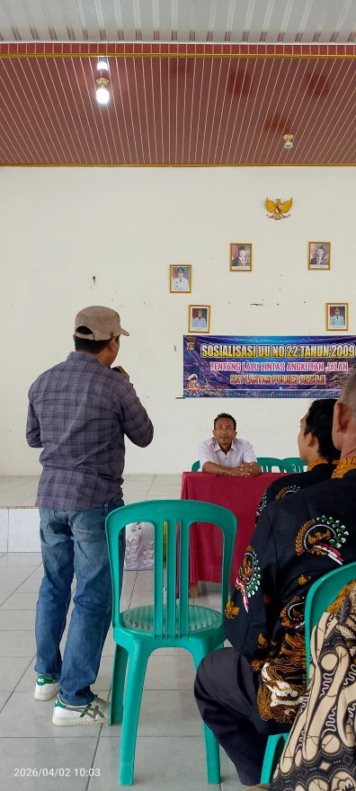 Pada hari Kamis, 2 April 2026, Satlantas Polres Mesuji IPDA JOHAN ARISANDI SH.MH melaksanakan kegiatan sosialisasi Undang-Undang Nomor 22 Tahun 2009 tentang Lalu Lintas dan Angkutan Jalan. Kegiatan ini berlangsung di Balai Desa Simpang Pematang dengan dihadiri oleh para aparatur desa setempat.